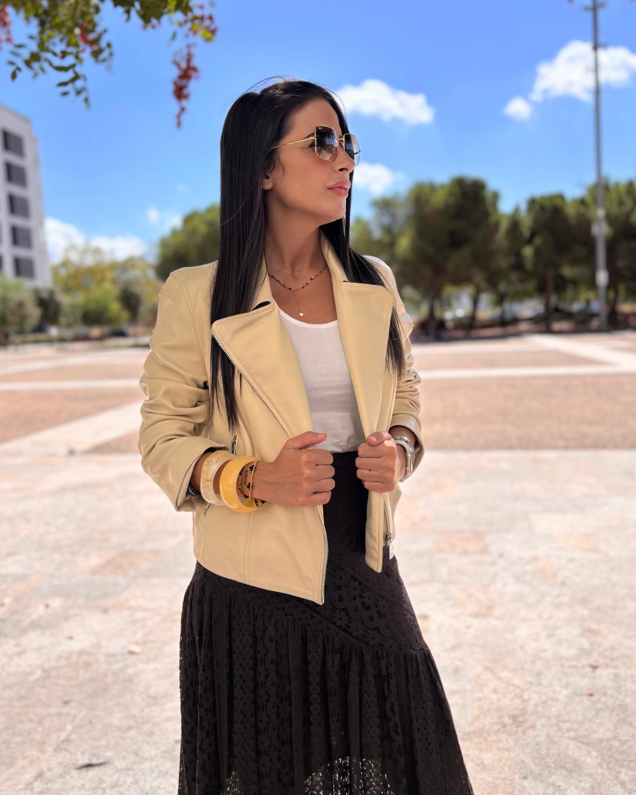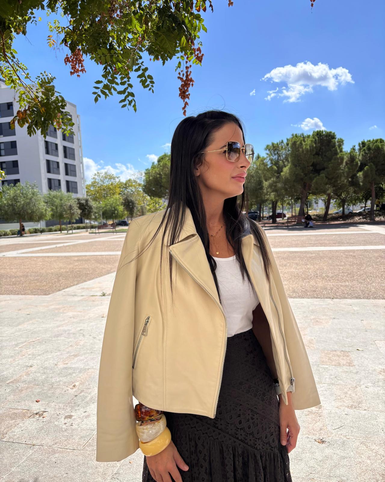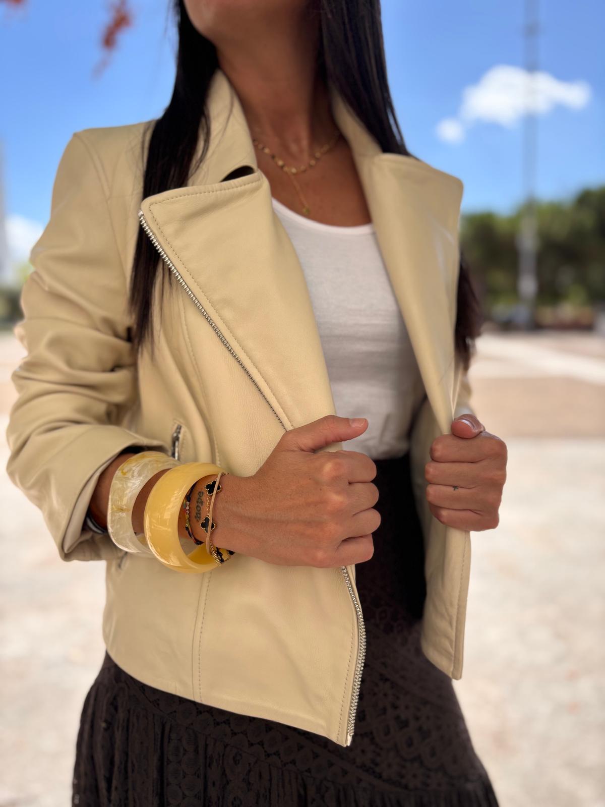 Cazadora de piel ovina de alta calidad.Corte cruzado estilo perfecto.Cremalleras en plata.