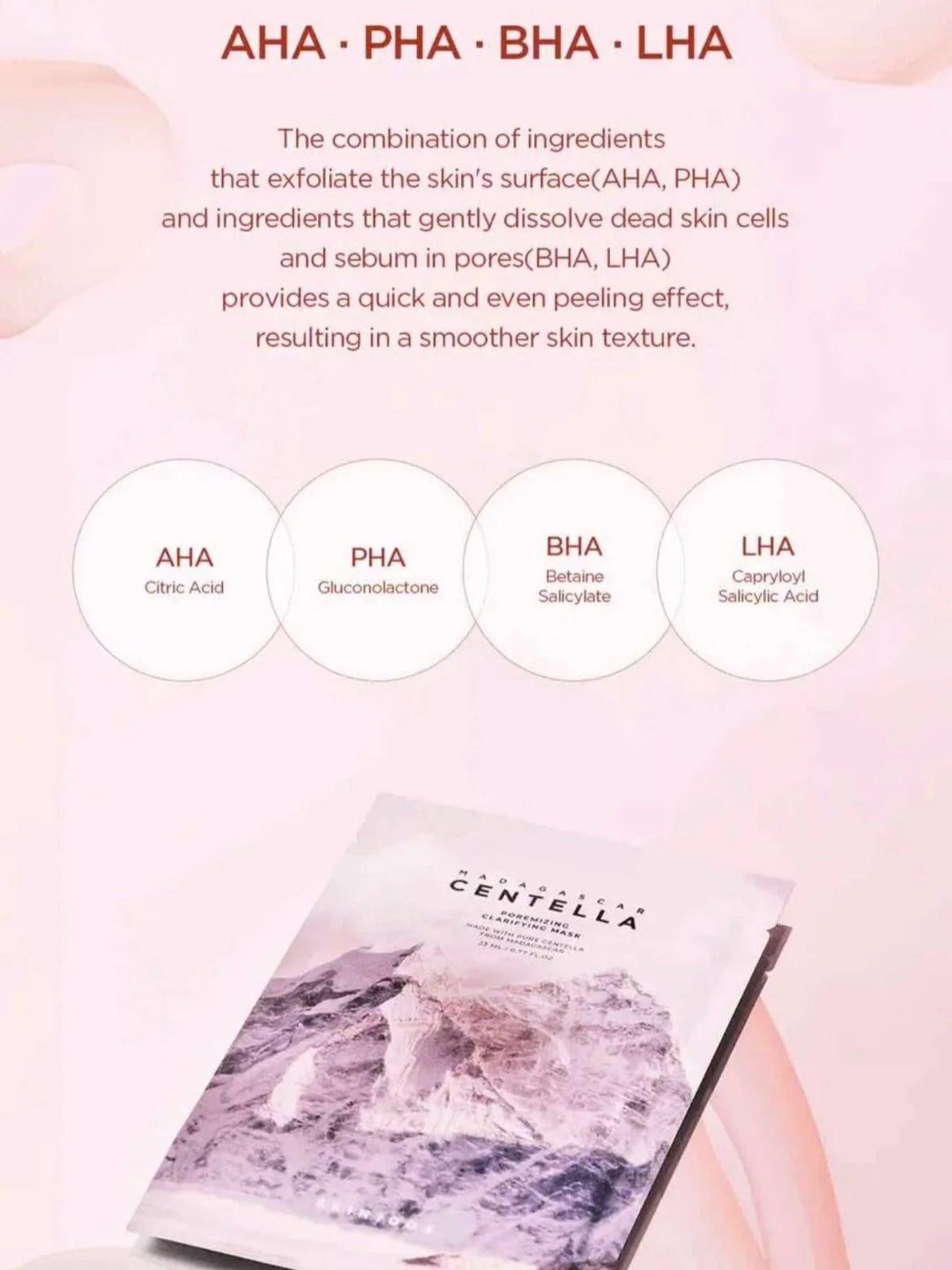 SKIN1004 - Madagascar Centella Poremizing Clarifying Mask - una mascarilla clarificante infundida con sal rosa del Himalaya y ácido succínico para desintoxicar los poros y absorber el exceso de grasa. Enriquecido con extracto de Centella Asiatica, AHA, BHA, PHA y LHA, exfolia suavemente, purifica y refresca la piel, dejándola suave, tranquila y equilibrada.