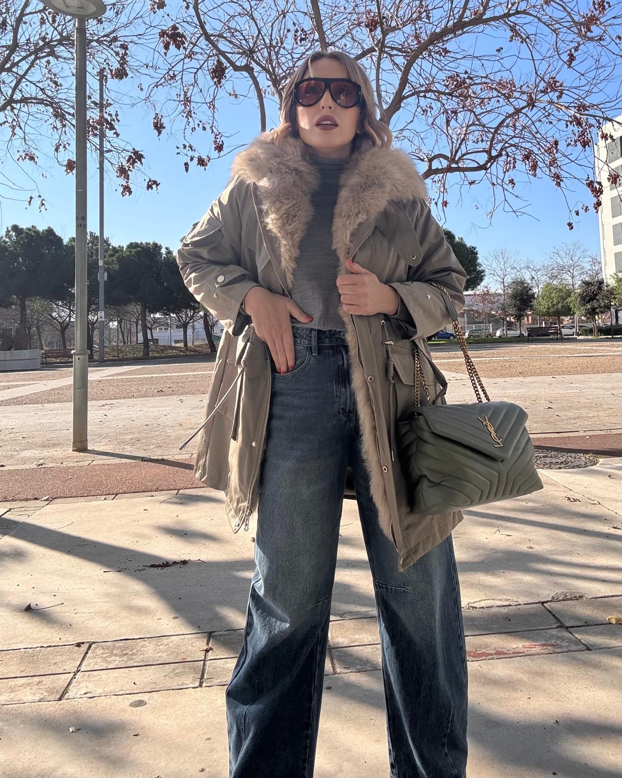 El cuello está adornado con un lujoso pelo de zorro natural, que aporta calidez y un toque elegante.