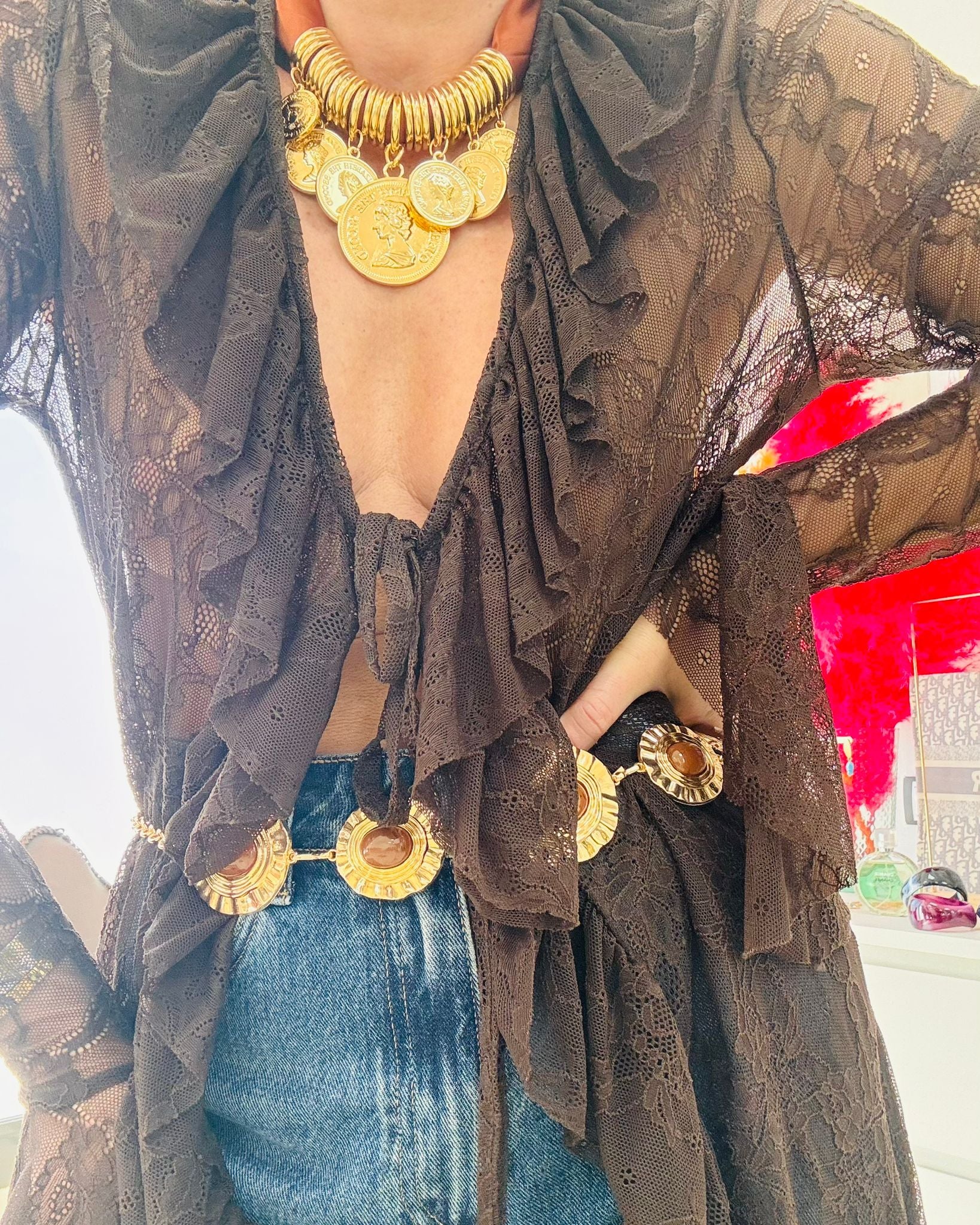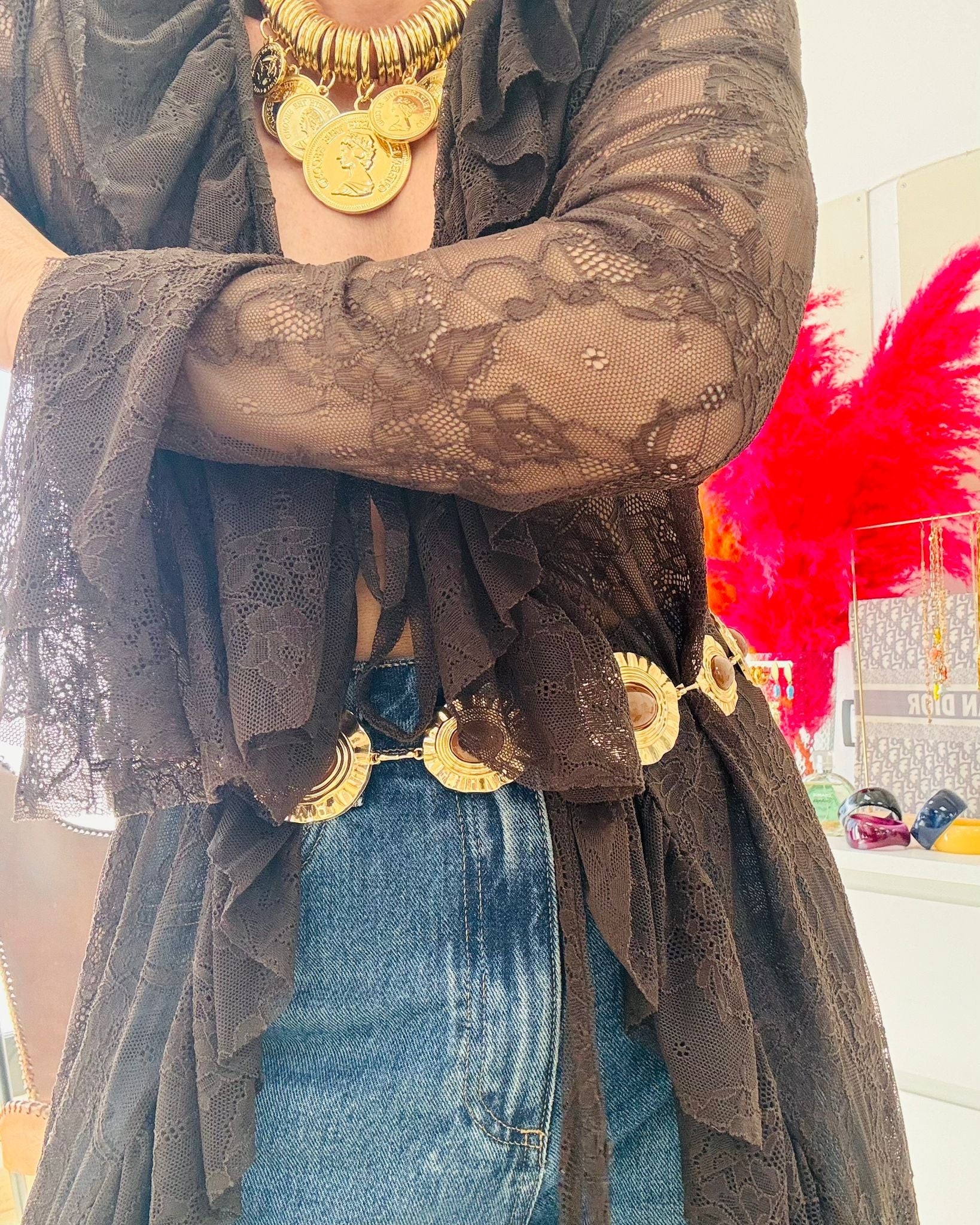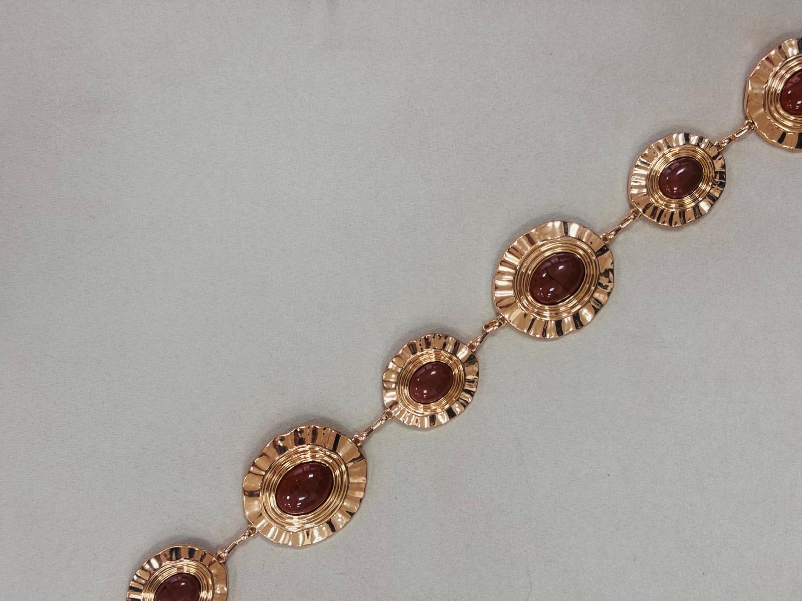 Cinturón de eslabones dorados con cadena y piedras en tonos teja.