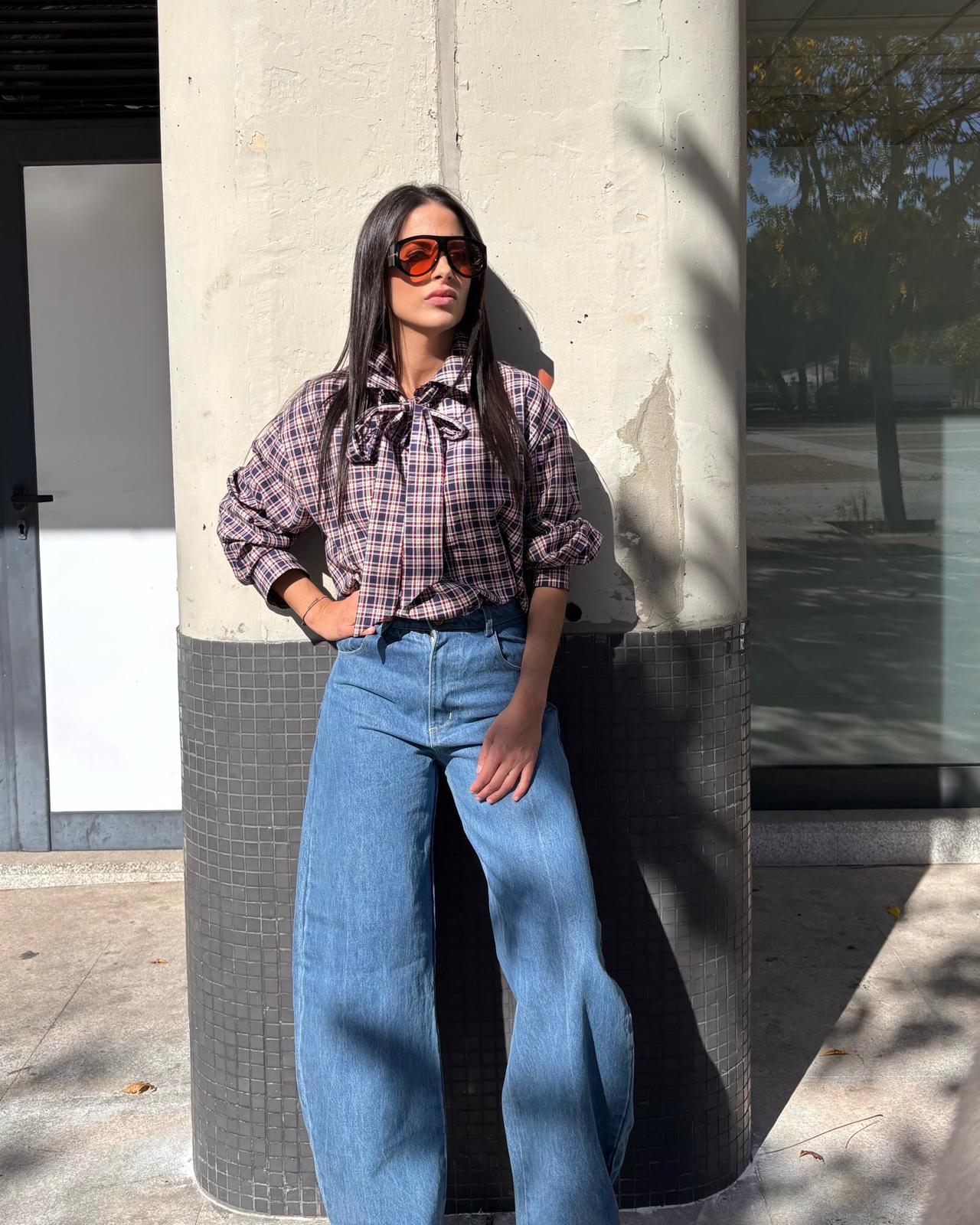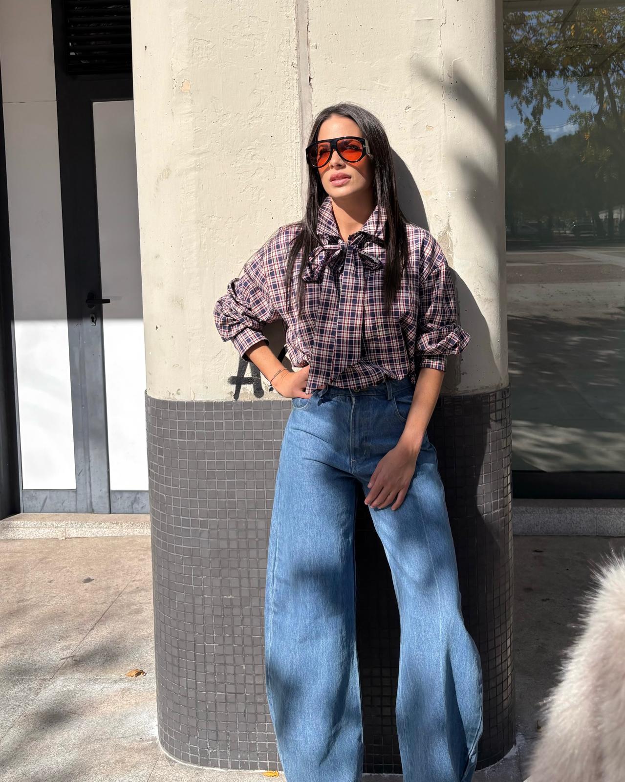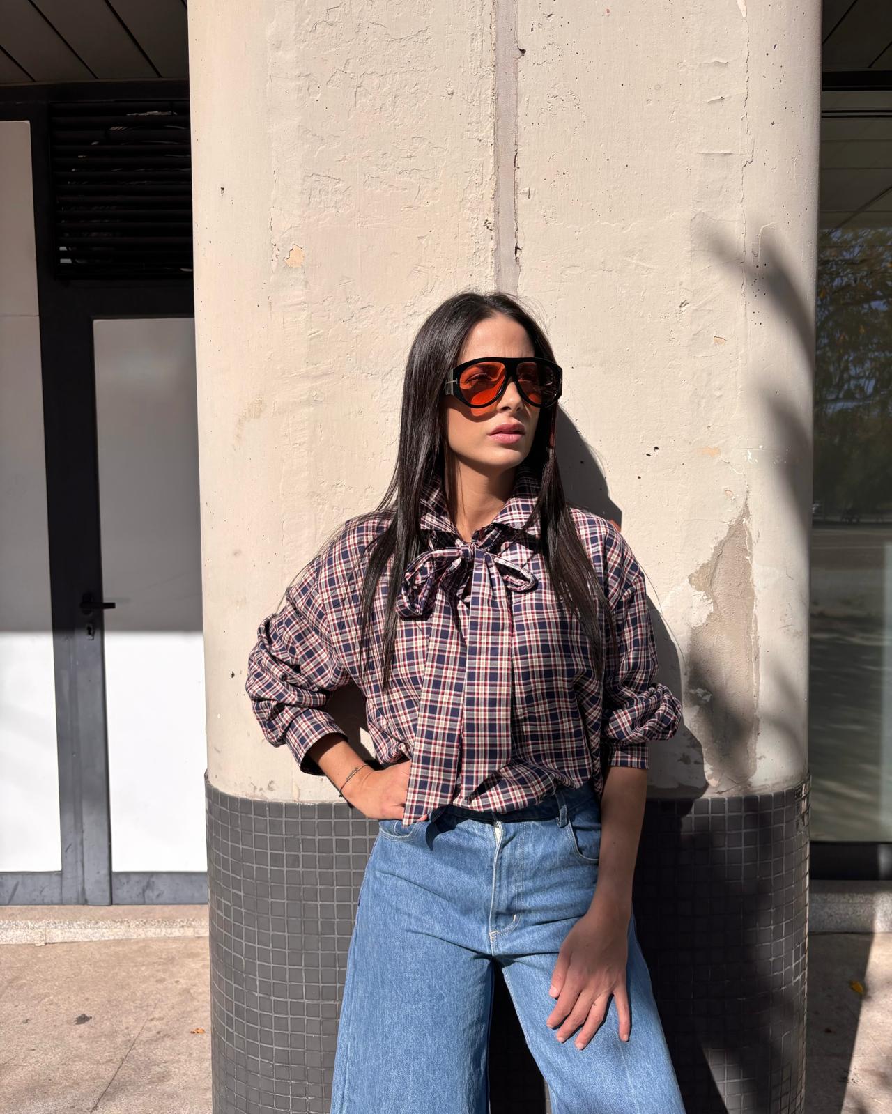 Camisa de cuadros over .Anudada al cuello con Lazada extraíble .