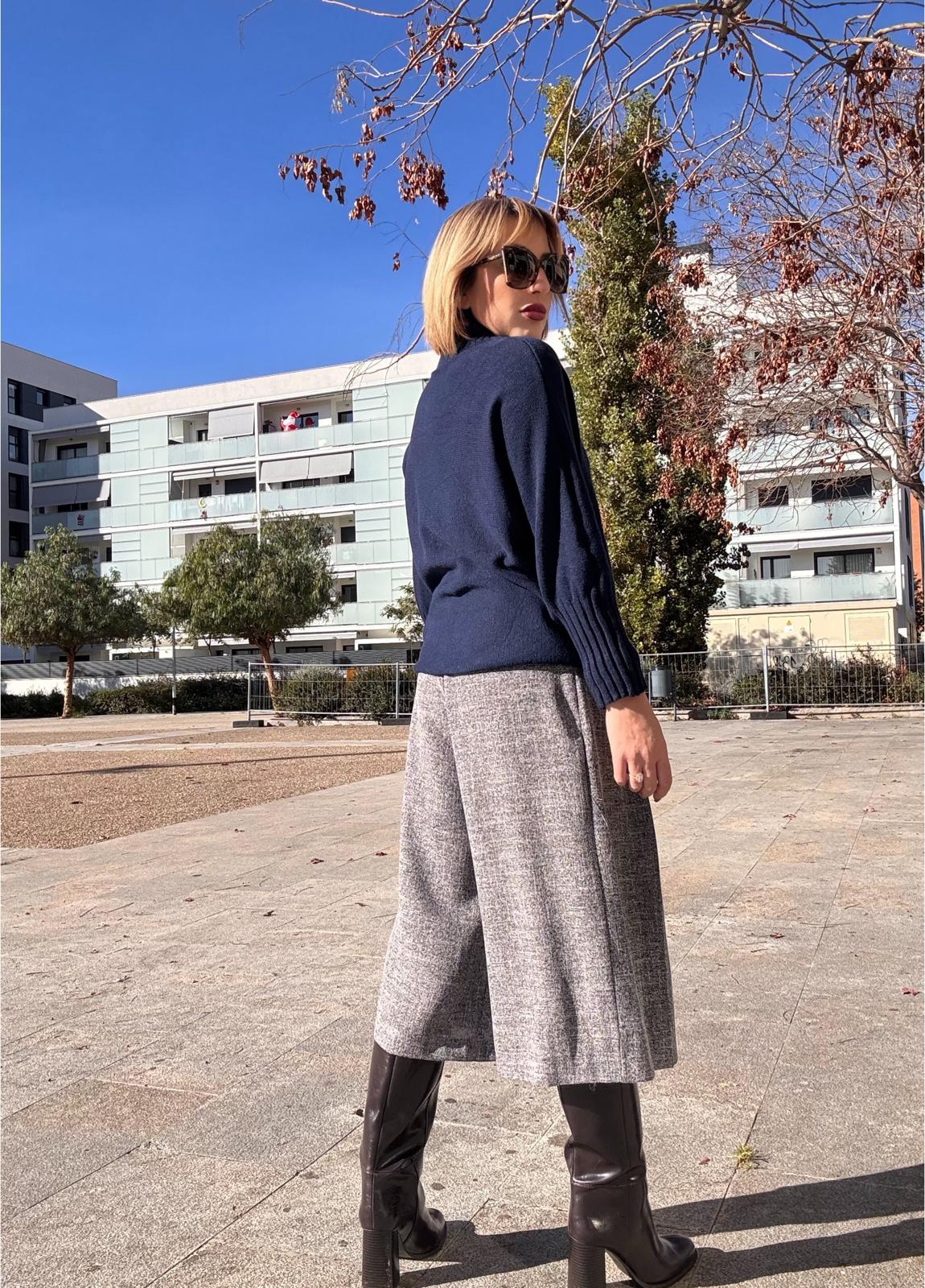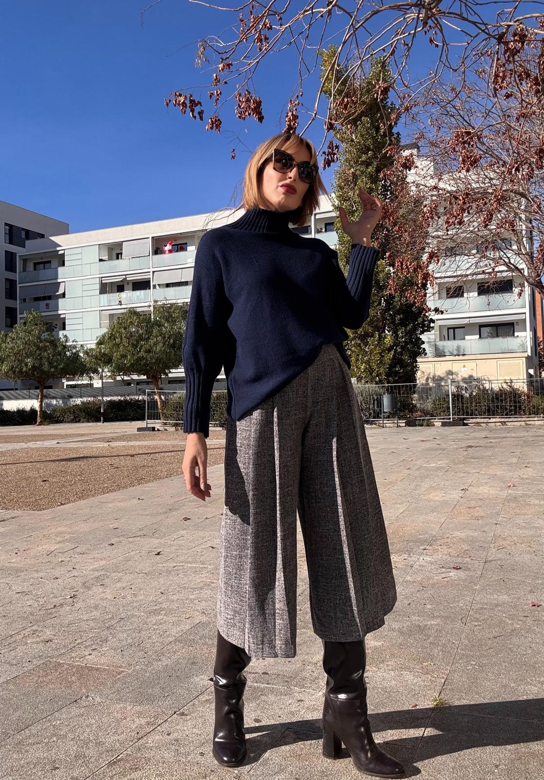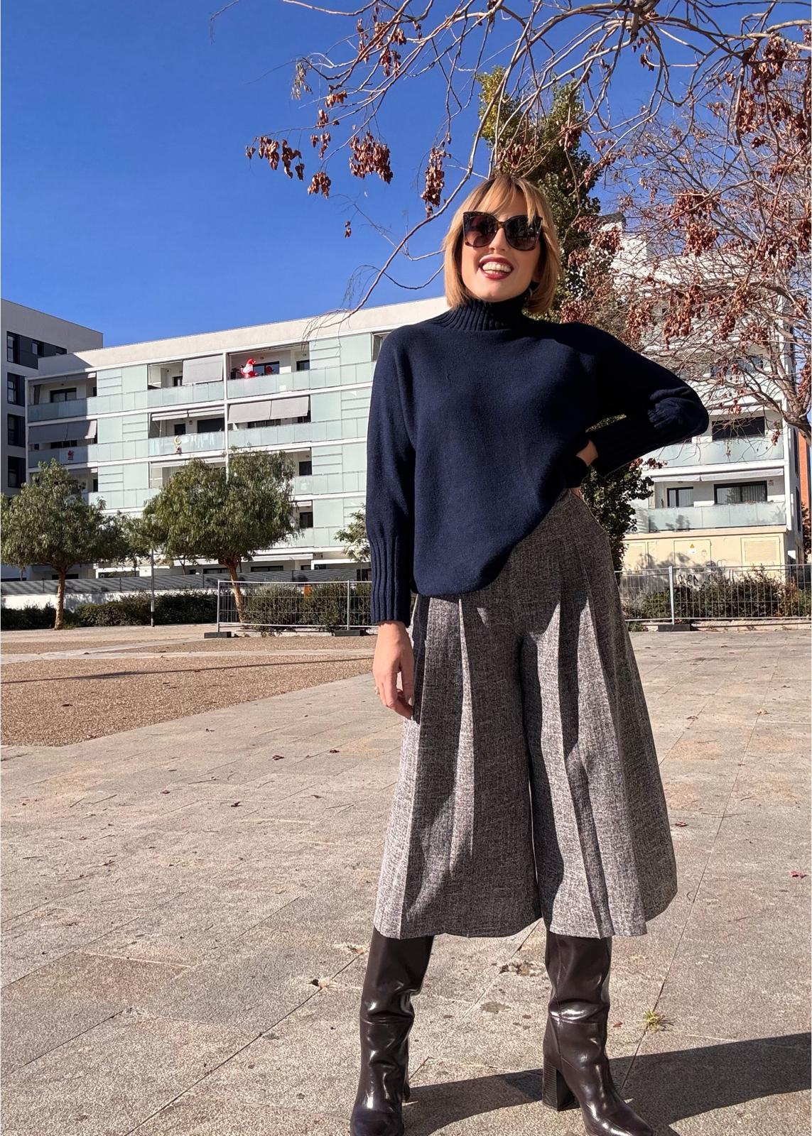 Pantalón estilo bermuda ancho .Tiro alto ,con pinza delantera .La modelo mide 1,60cm y habitualmente usa la talla S .