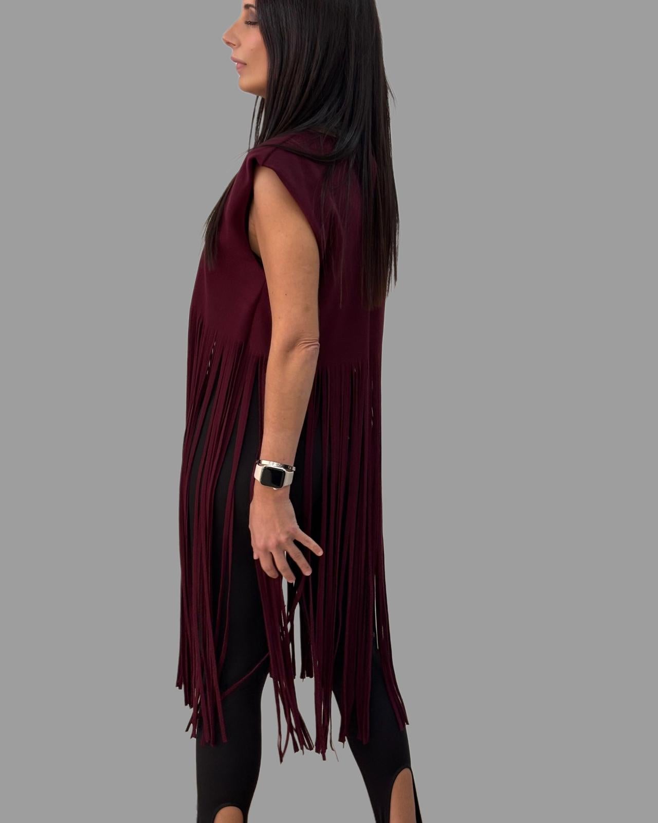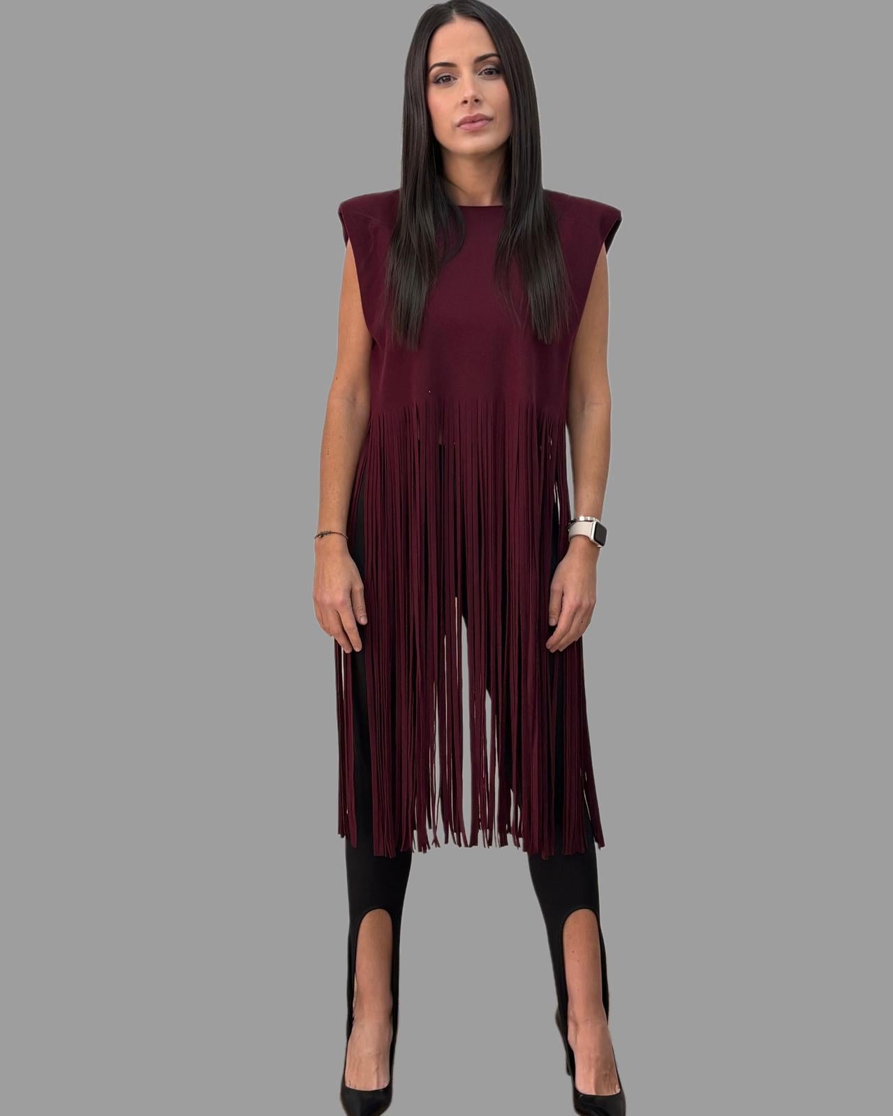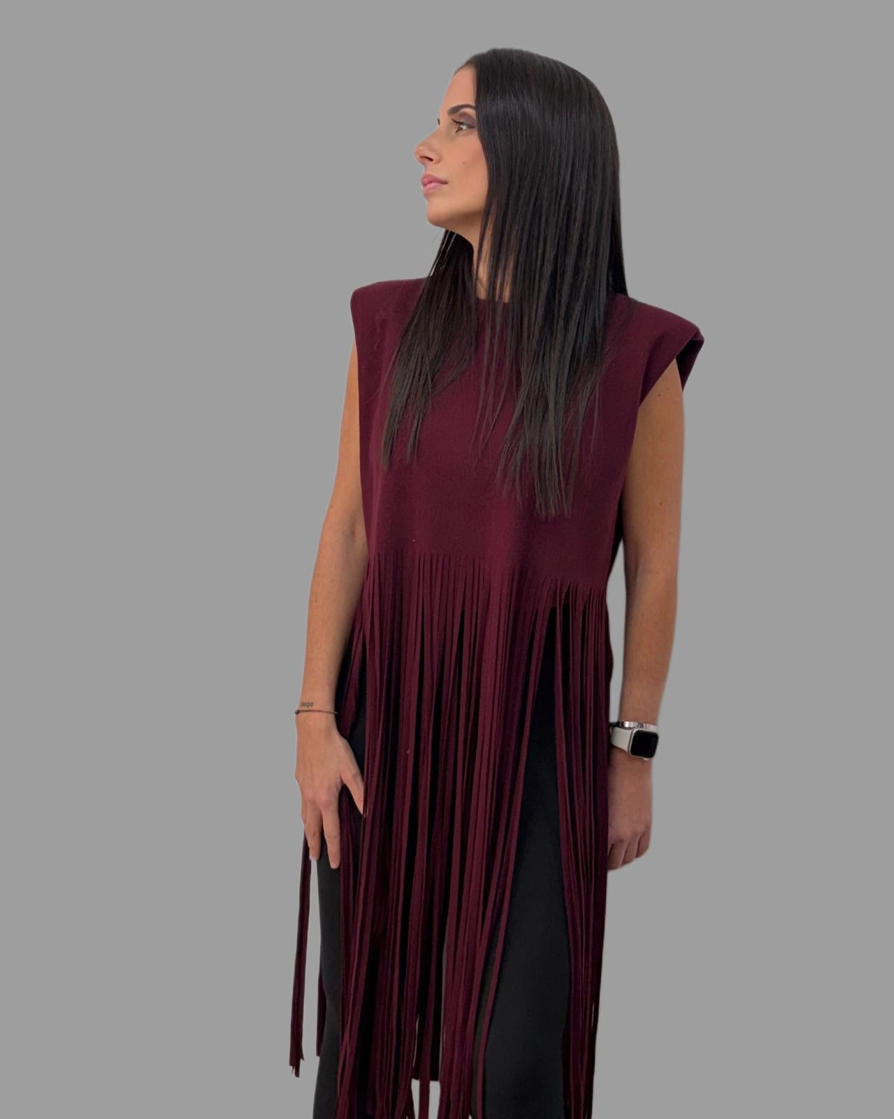 Top de paño sin mangas ,hombrera incorporada.Bajo con flecos .