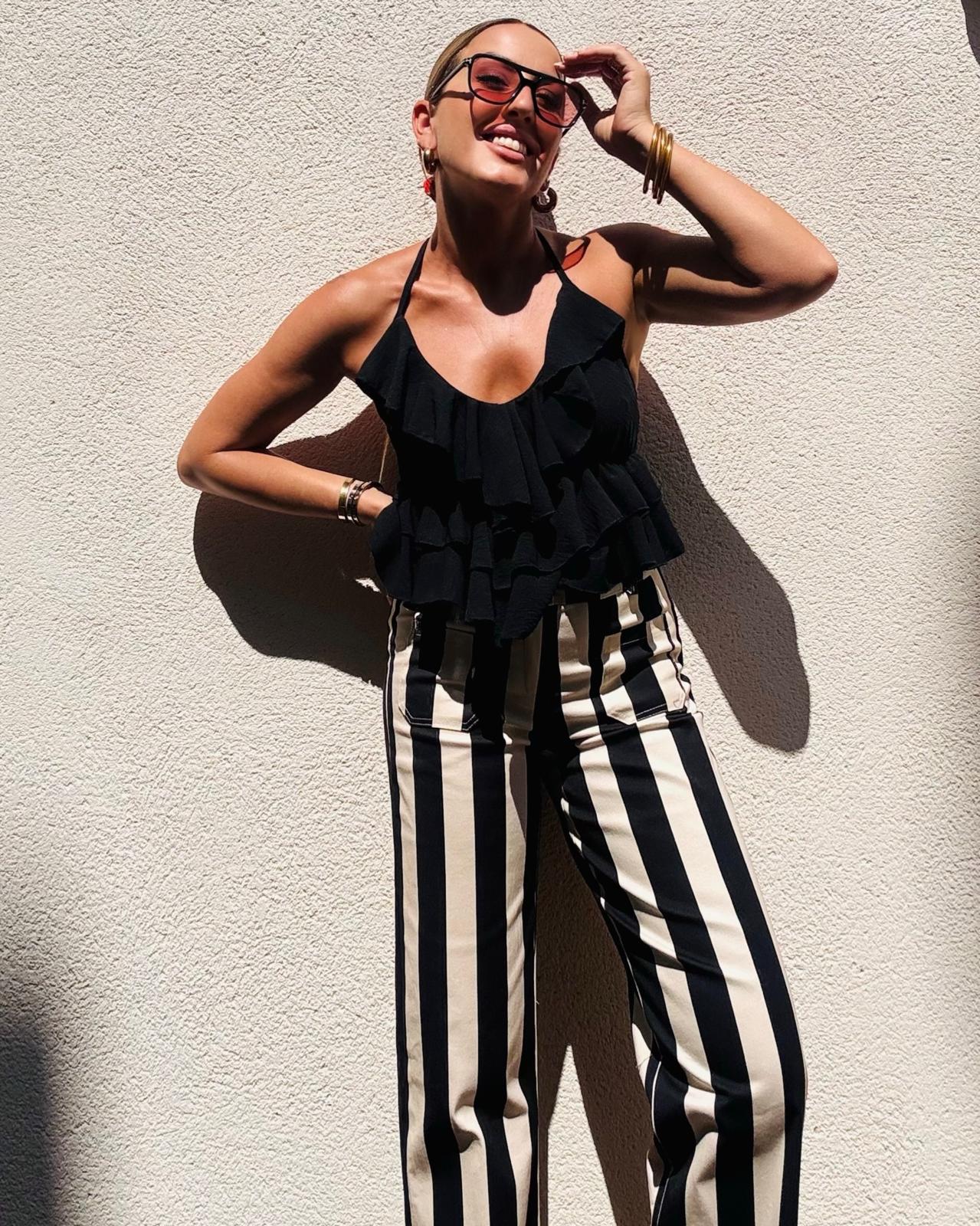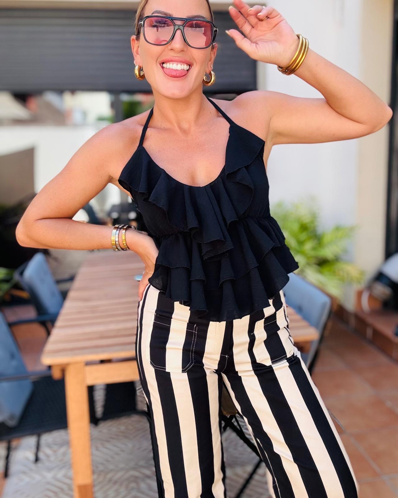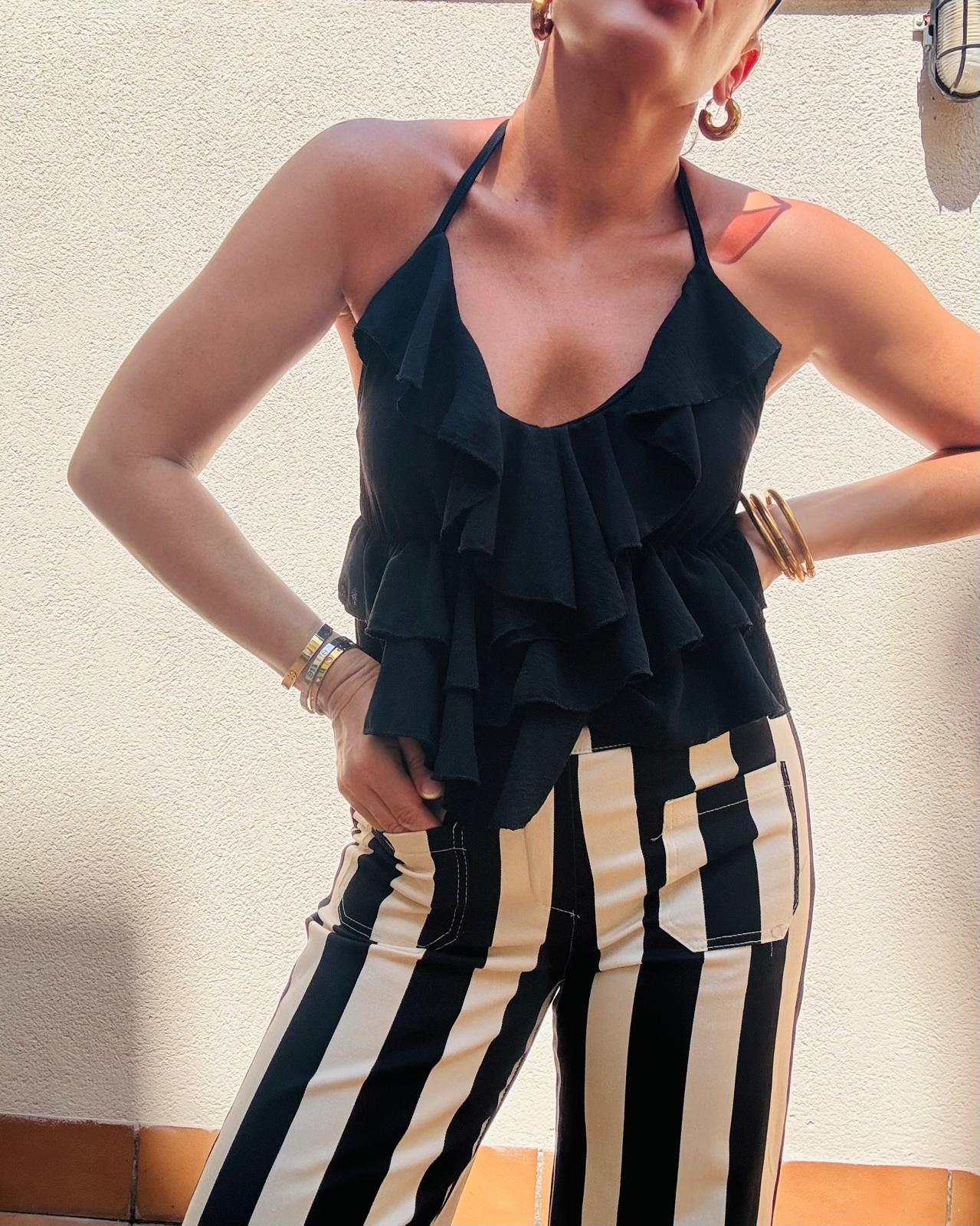 Top de viscosa ,atado al cuello.Volantes delanteros .Espalda elástica con nido de abeja.