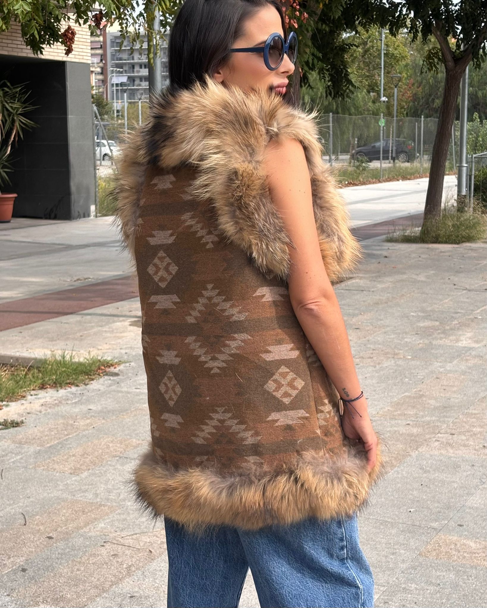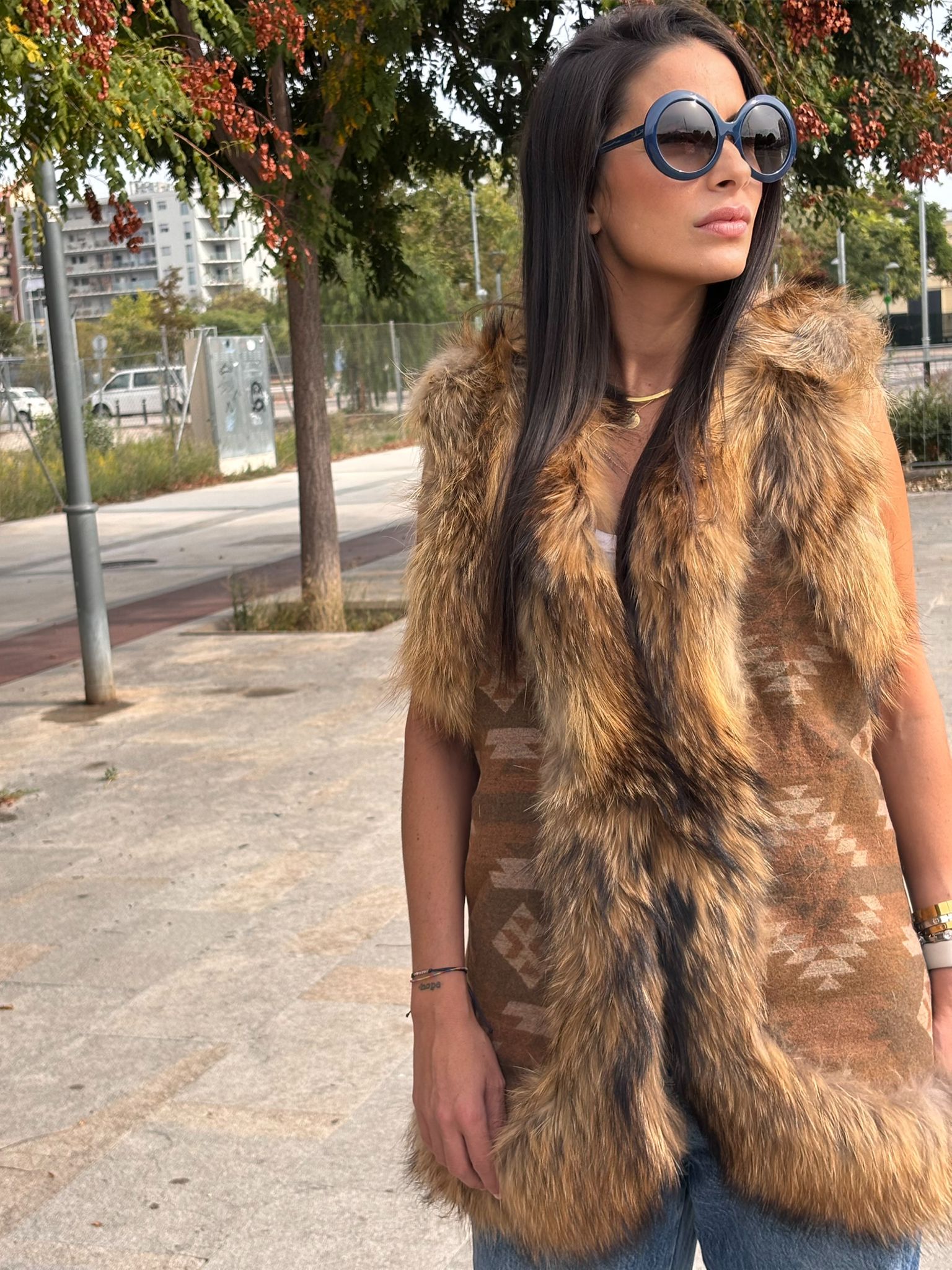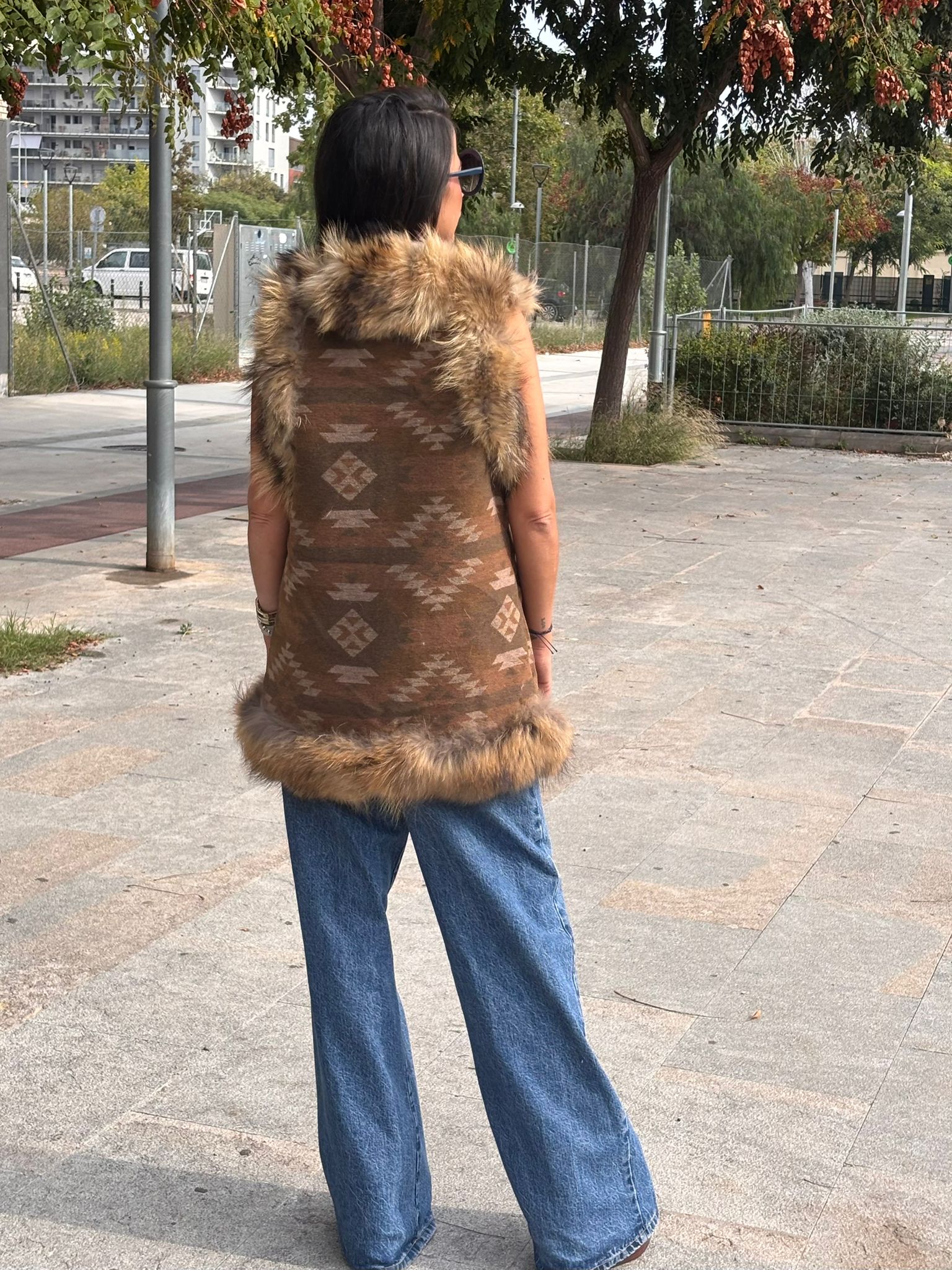 Chaleco de tejido étnico y pelo natural.Forrado con cierre delantero ,más largo que el chaleco Emma.