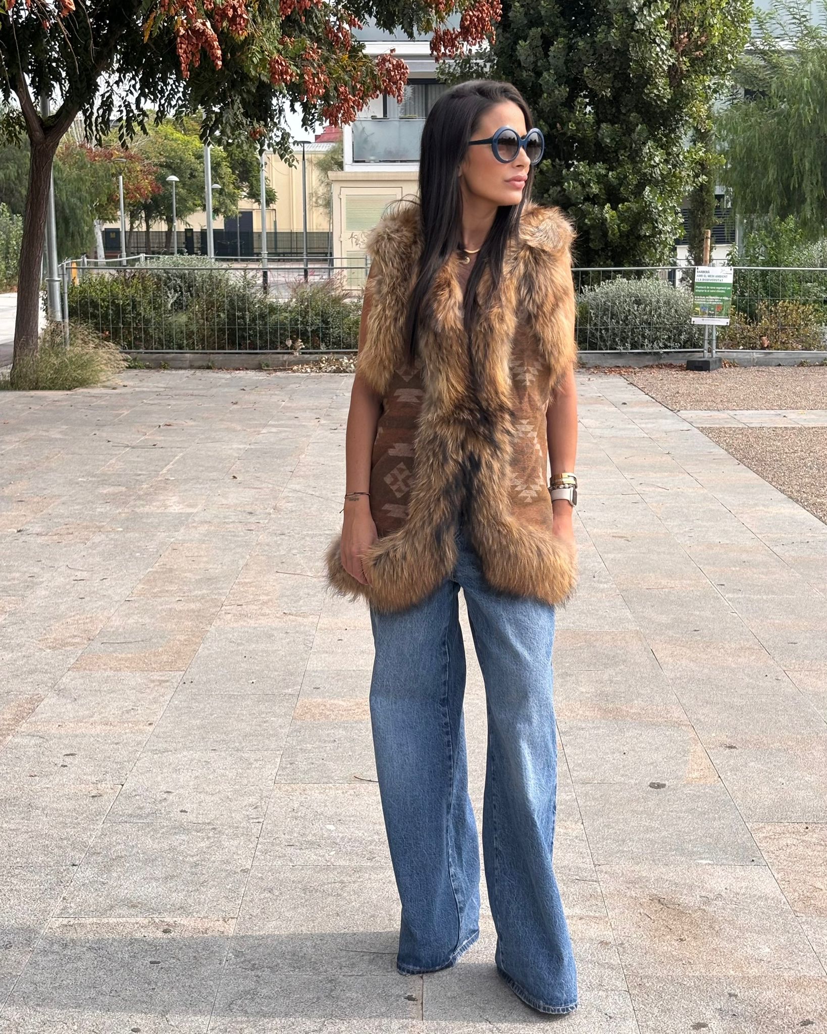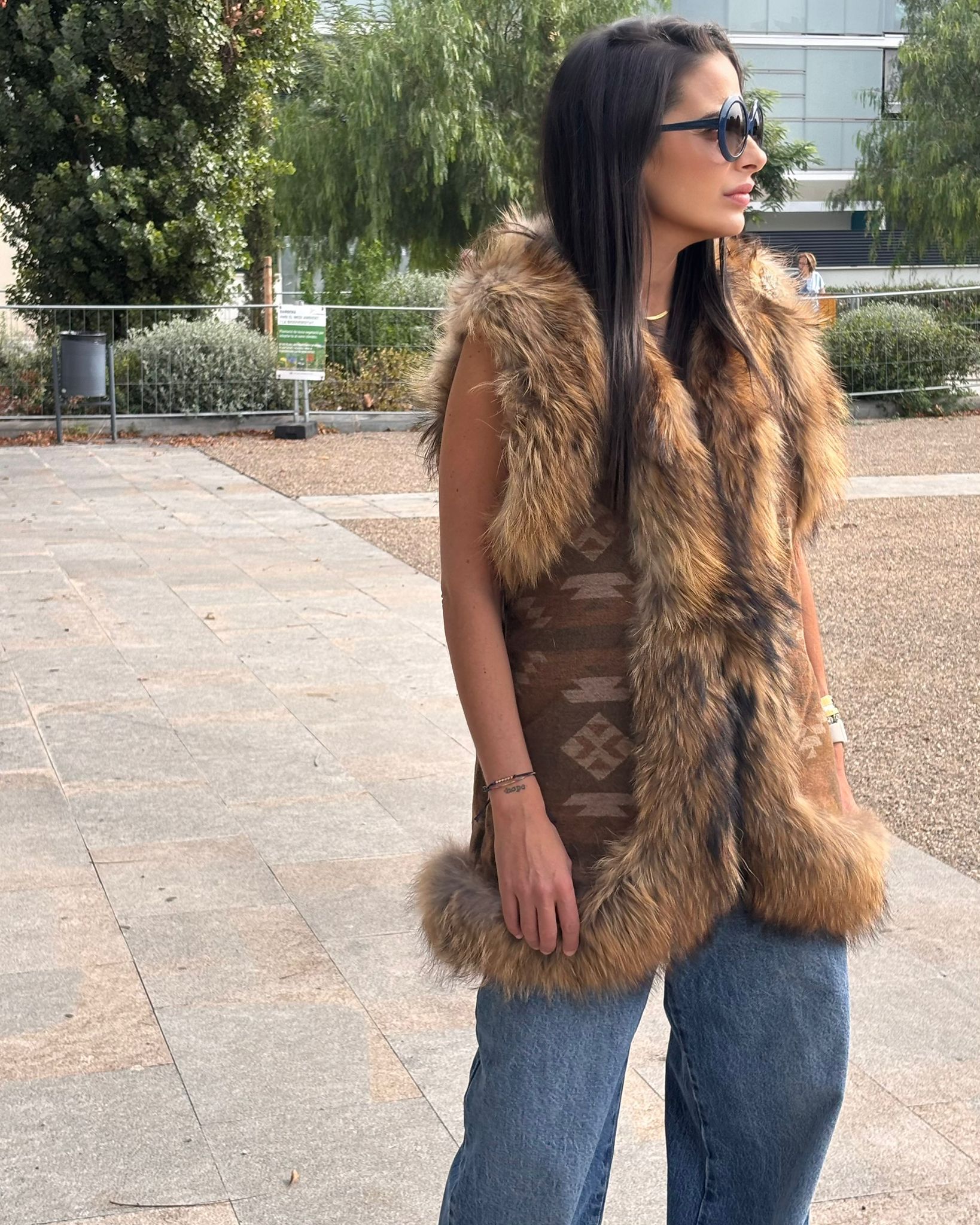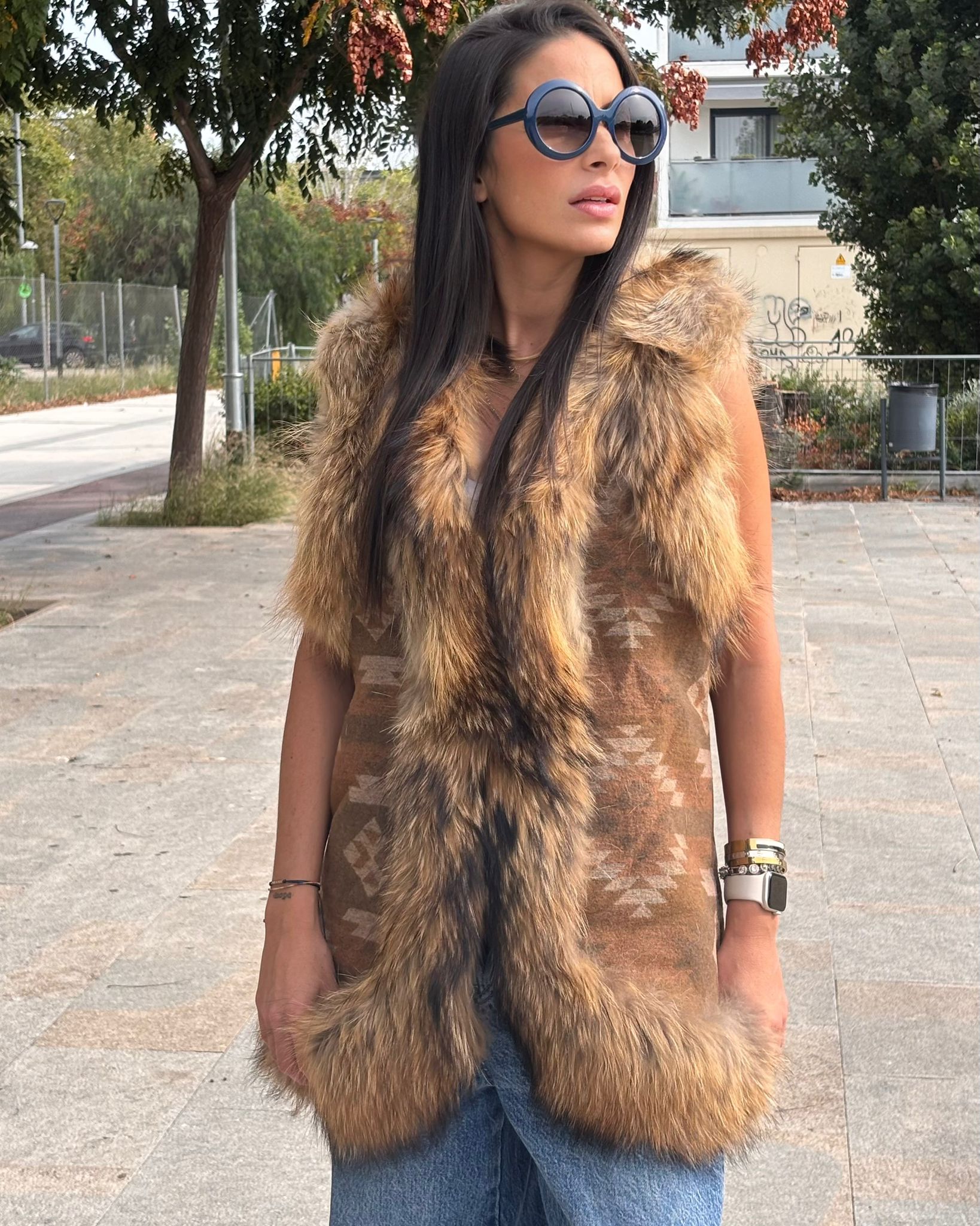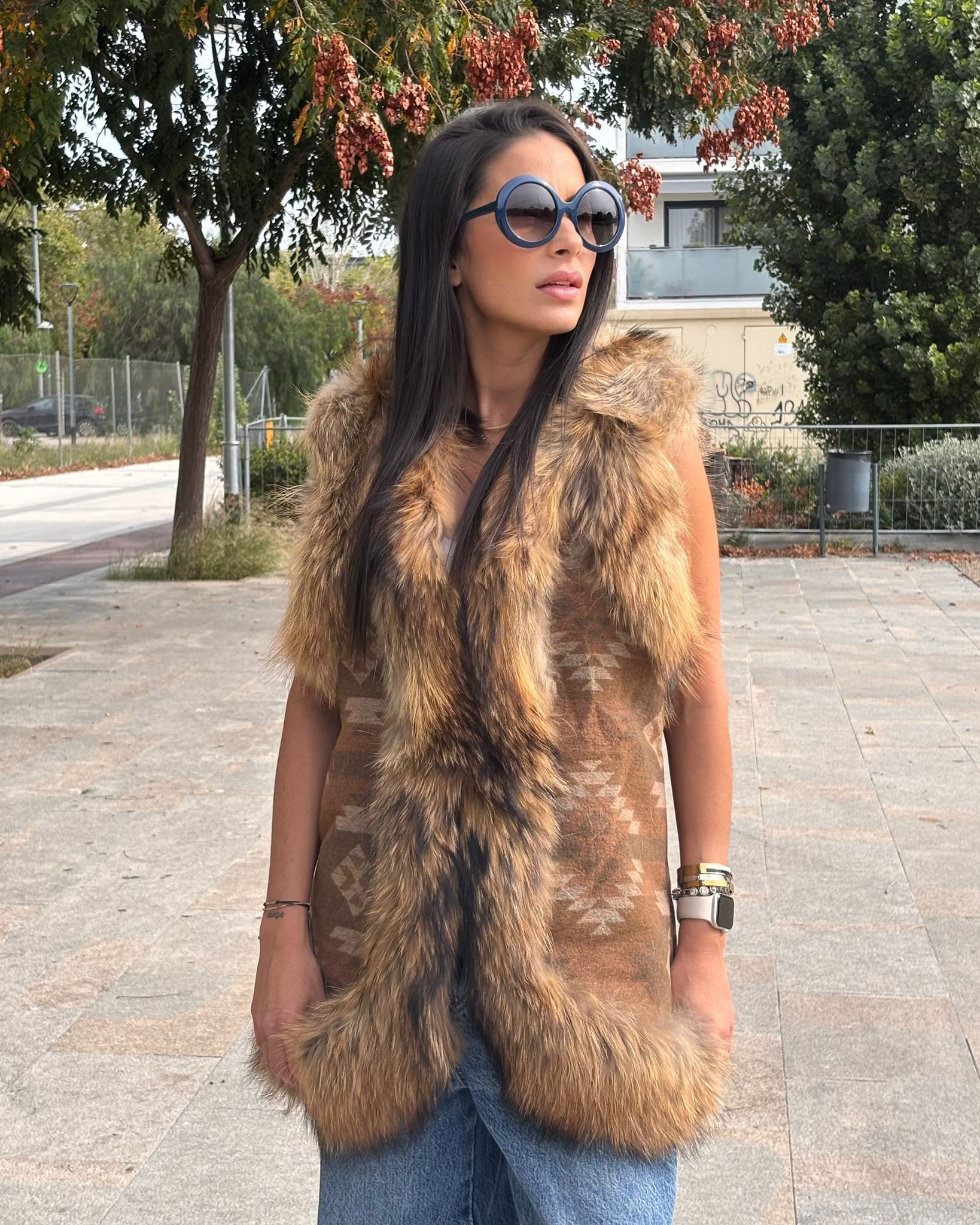 Chaleco de tejido étnico y pelo natural.Forrado con cierre delantero ,más largo que el chaleco Emma.