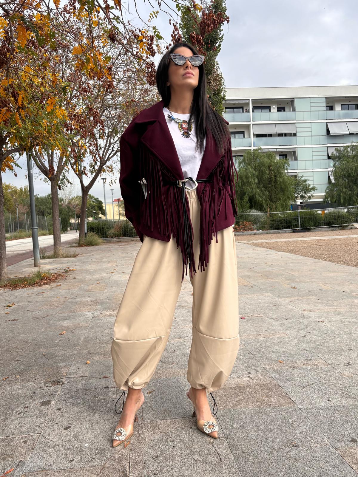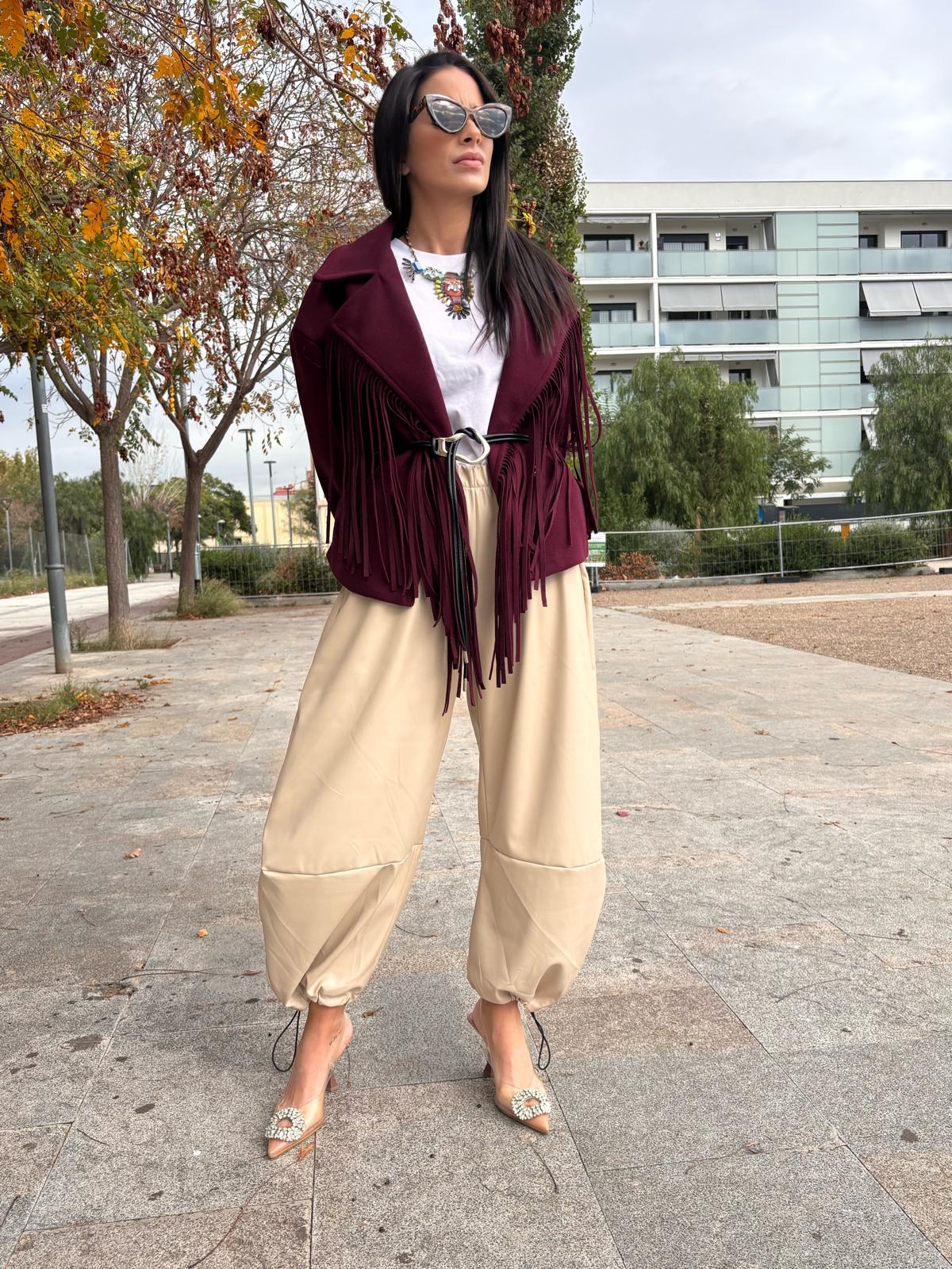 Pantalón eco piel bombacho.Tiro medio /alto .Goma en la cintura.La modelo mide 1,70cm y habitualmente usa la talla S.