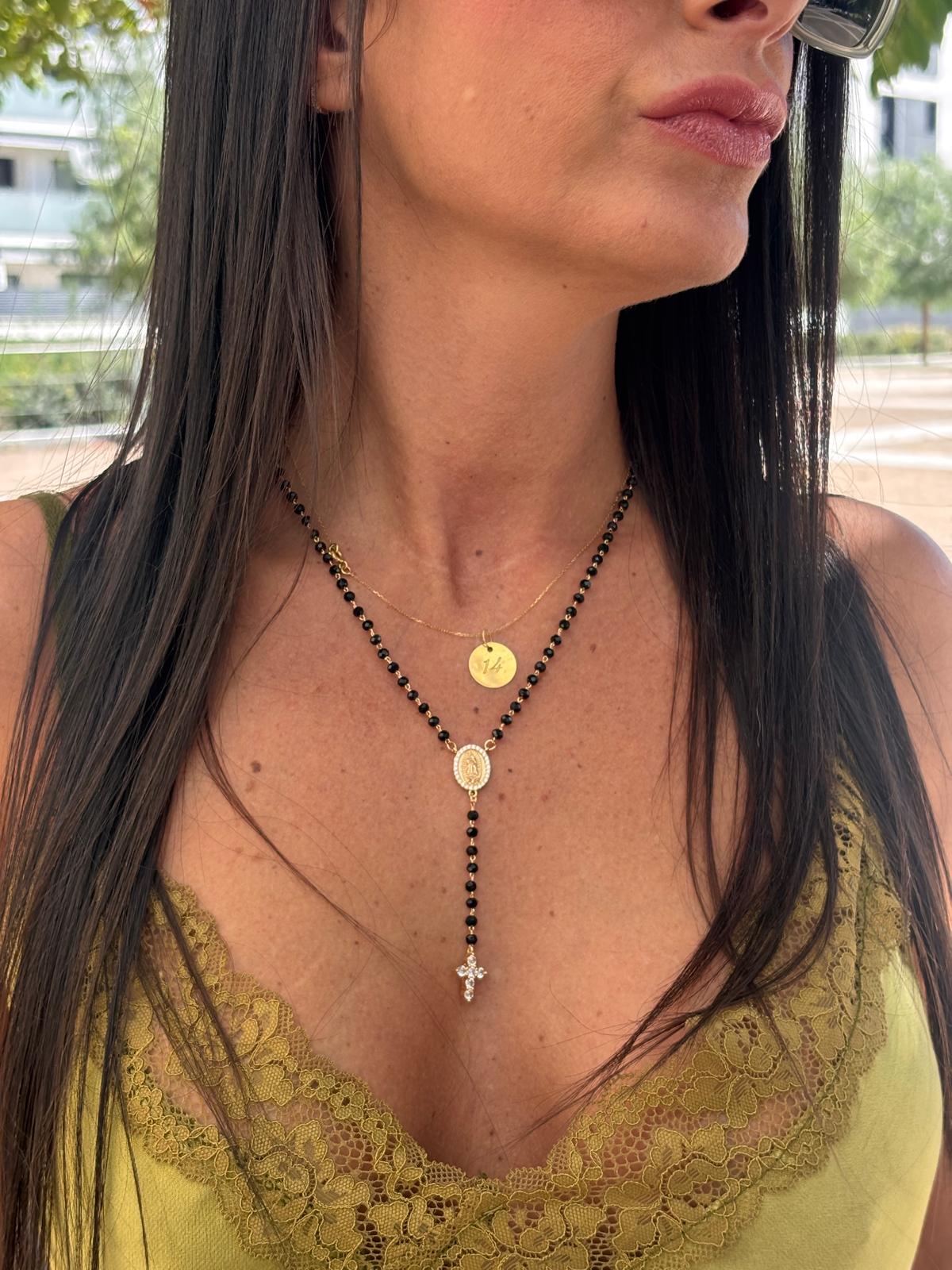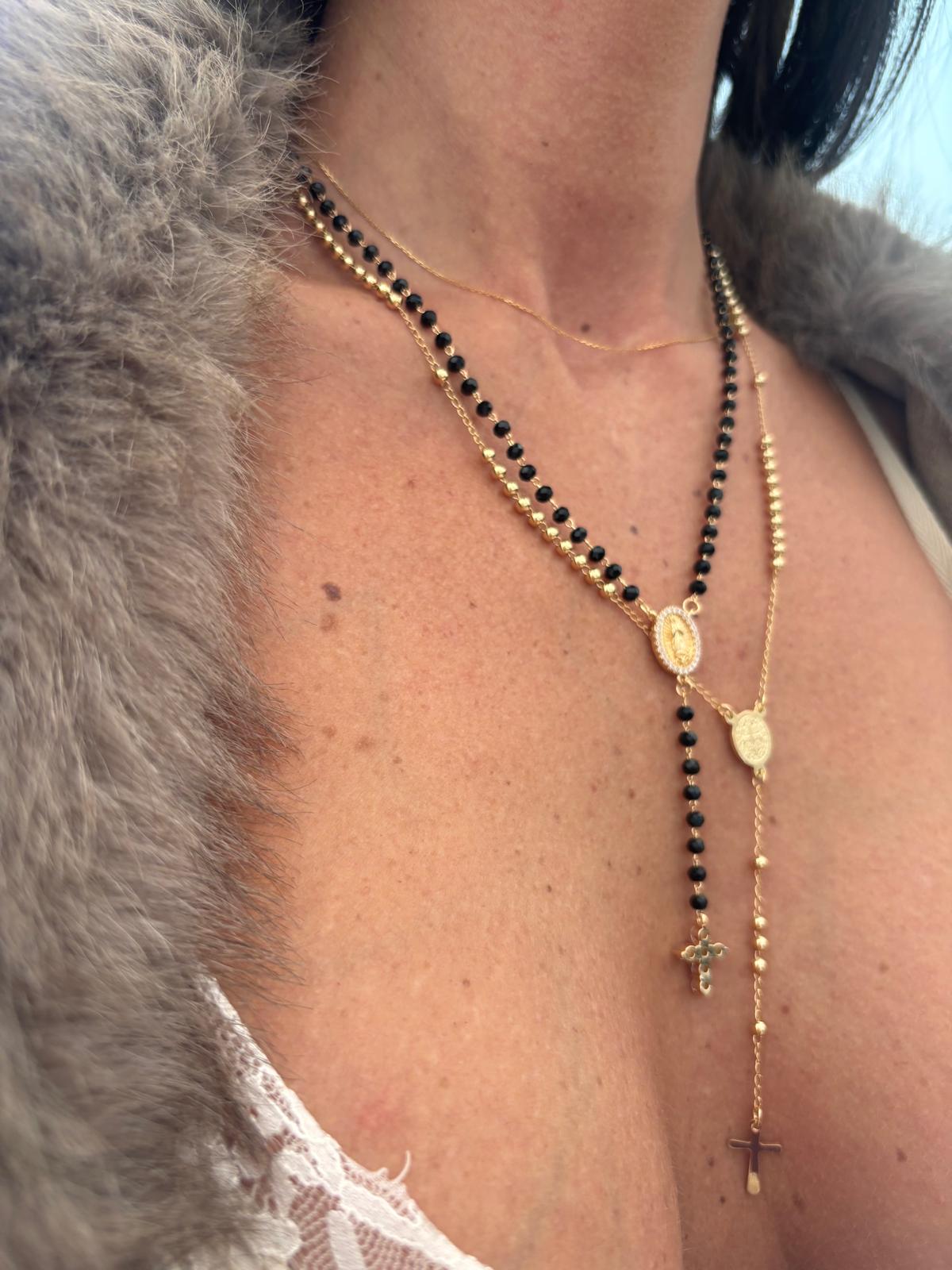 Collar estilo rosario de mini piedras negras.Acero dorado y cruz con strass.
