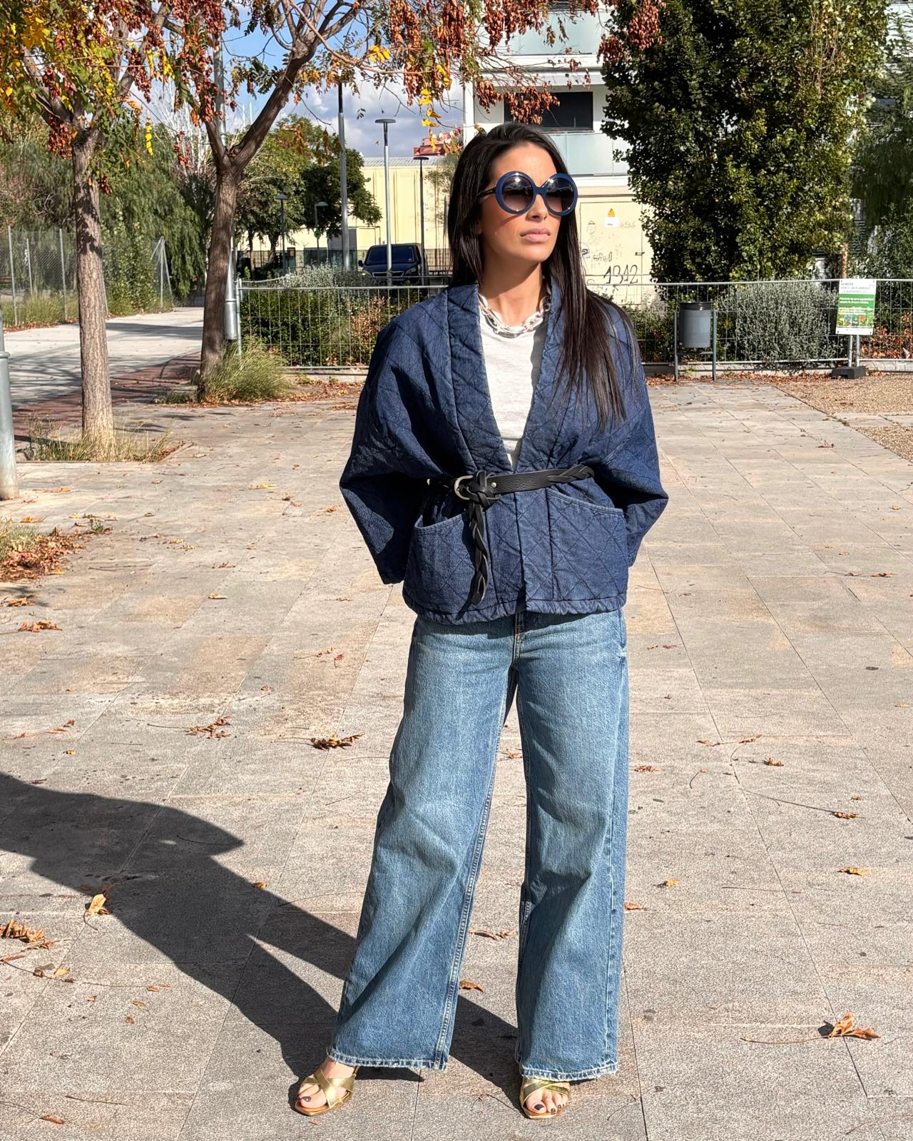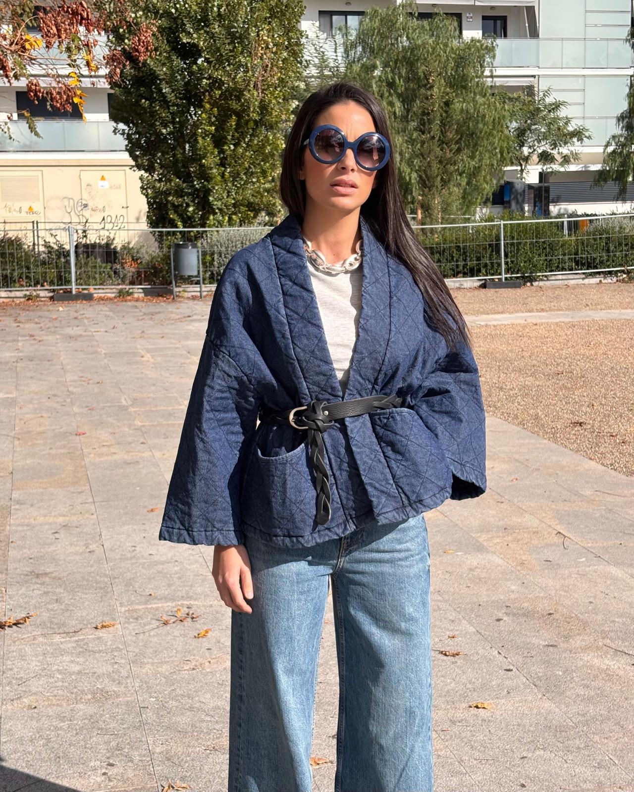 Kimono corto acolchado en tejido denim.Abierto ,ideal para lucir suelti o como en la foto con cinturón.