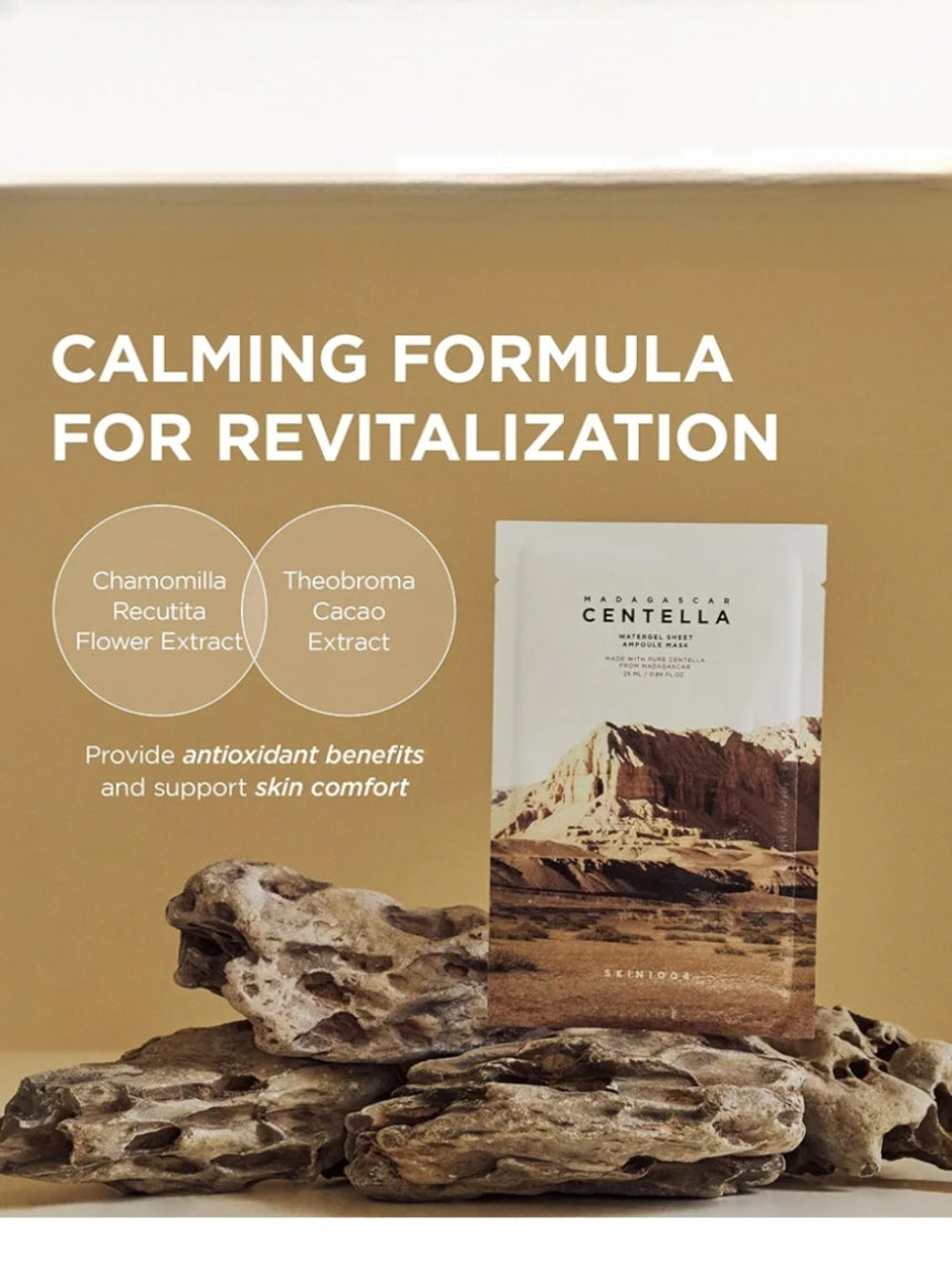 SKIN1004 - Mascarilla de ampolla de lámina de gel de agua de Madagascar - una mascarilla de lámina de primera calidad saturada con extracto de Centella Asiática y diseñada para proporcionar el triple de la humedad de las mascarillas típicas. Su exclusivo material de gel de agua asegura que la esencia penetre profundamente, mientras que el aceite de menta de maíz proporciona un efecto refrescante para calmar el enrojecimiento y equilibrar el sebo. Ideal para pieles sensibles, irritadas o deshidratadas.